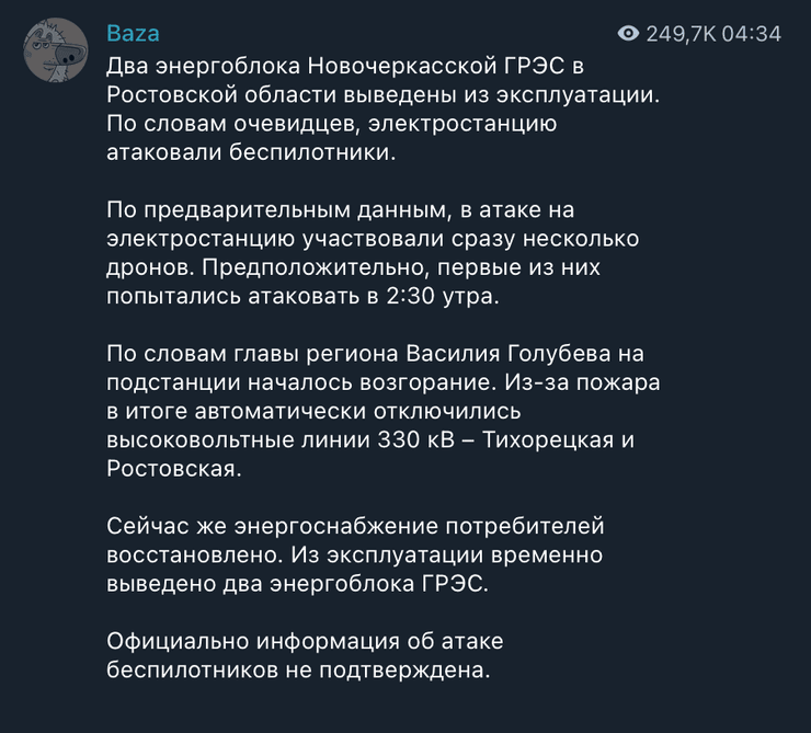Российское издание Baza со ссылкой на очевидцев заявило, что электростанцию атаковали беспилотные летательные аппараты.
