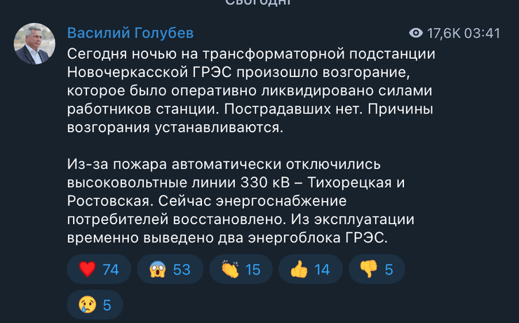 "Сегодня ночью на трансформаторной подстанции Новочеркасской ГРЭС произошло возгорание, которое было оперативно ликвидировано силами работников станции", — сказал Василий Голубев.