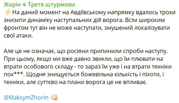 На Авдеевском направлении удалось немного снизить динамику наступательных действий со стороны российских войск. Подробности 27 марта в Telegram сообщил Максим Жорин, заместитель командира 3 ОШБр.
