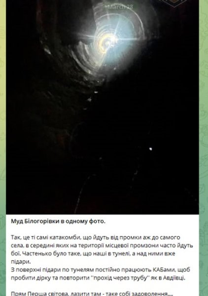 "Муд Белогоровки в одном фото. Да, это те самые катакомбы, которые идут от промки до самого села, в середине них на территории местной промзоны часто идут бои. Частенько было такое, что наши в тоннеле, а над ними уже п**ары", — рассказал он.