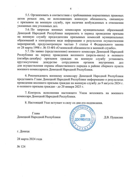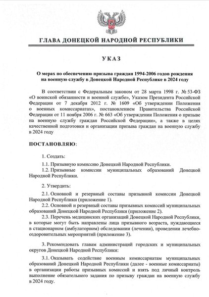 Название обнародованного указа "О мерах по обеспечению призыва граждан 1994–2006 годов рождения на военную службу в Донецкой Народной Республике в 2024 году".