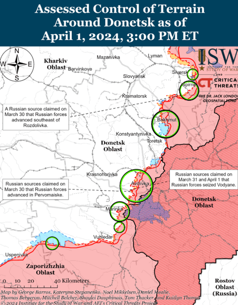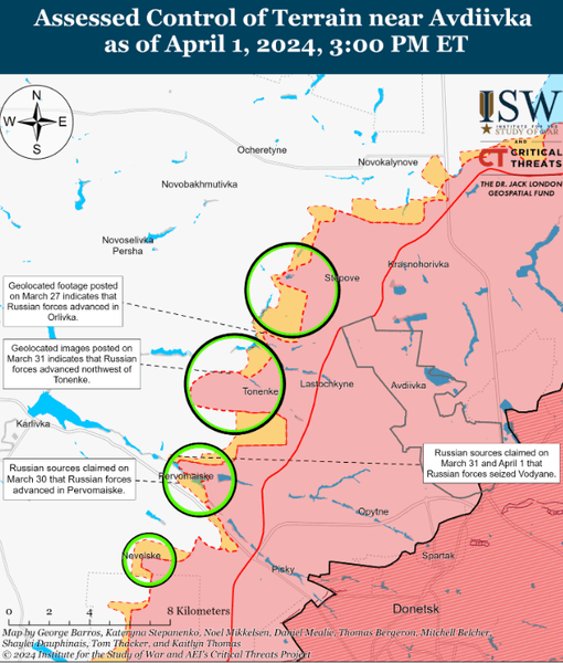 На фоне продолжения 1 апреля позиционных боев вдоль всей линии соприкосновения российские войска продвинулись вблизи Авдеевки и на восточном (левом) берегу Днепра в Херсонской области. Об этом сообщает Институт изучения войны (ISW) в отчете за 1 апреля.