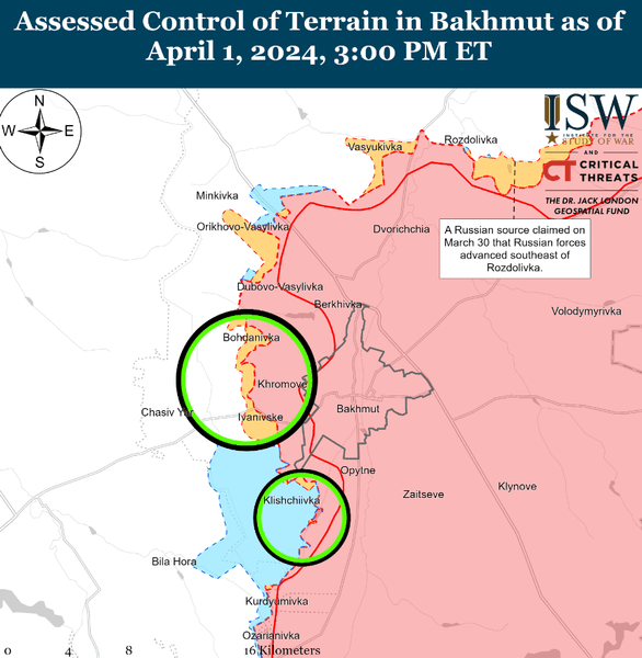 Геолокационные кадры, опубликованные 1 апреля, показали последствия неудачного наступления российской бронетехники на Ивановское (между Часовым Яром и Бахмутом). Один из российских военных блогеров утверждает, что российские войска во время атак вблизи Ивановского за последние дни потеряли 5-6 единиц бронетехники.