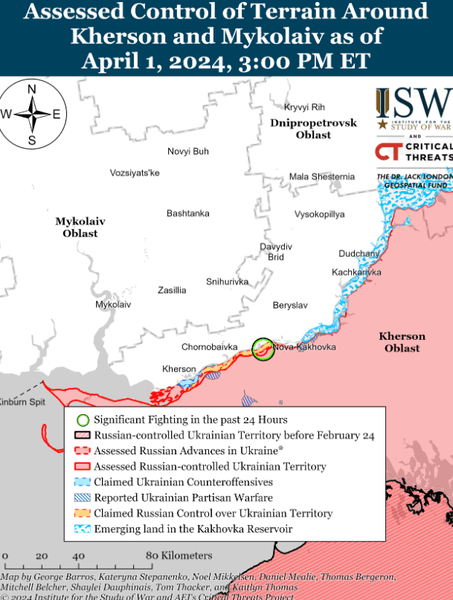 Геолокационная фиксация, опубликованная 31 марта, демонстрирует то, что российские оккупационные подразделения незначительно продвинулись к северу от Казачьих Лагерей (3 км от реки Днепр на восточном берегу Херсонской области), хотя это маловероятно в течение последних суток.