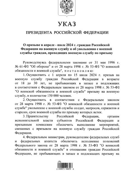 В частности, был отмечен указ президента РФ Владимира Путина от 31 марта, согласно которому на службу в российскую армию с 1 апреля по 15 июля должны поступить 150 000 человек. Также документ предписывает демобилизовать солдат, матросов, сержантов и старшин, срок военной службы по призыву которых истек. При этом ранее верхняя возрастная планка составляла 27 лет, а в этом году она поднялась до 30 лет.