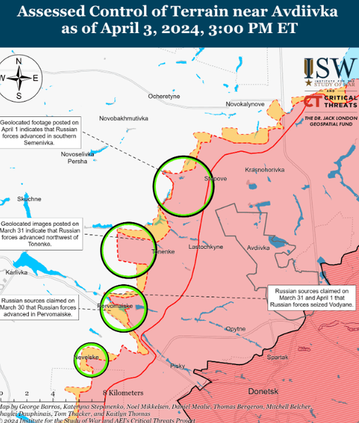 Возле поселка Тоненькое к западу от Авдеевки 30 марта состоялась батальонная российская механизированная атака, во время которой оккупанты могли задействовать не менее 12 БМП и 36 танков.