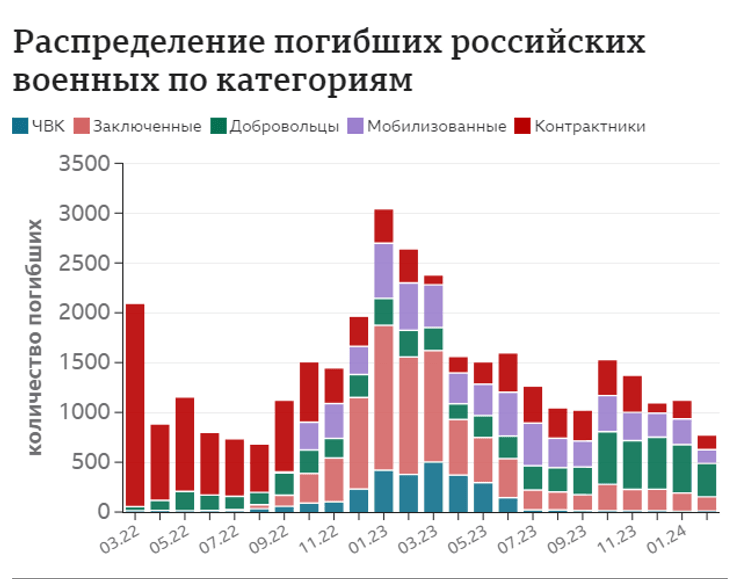 По данным журналистов, цифры потерь осени и зимы 2023 года уступают только потерям в ходе штурма Угледара и Бахмута зимой и весной прошлого года. Темпы роста потерь продолжают превышать средние показатели первого года вторжения в полтора-два раза.