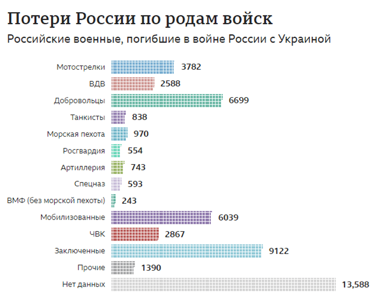 BBC с изданием "Медиазона" и командой волонтеров на основе открытых источников установили имена более 50 тысяч российских военных, погибших на войне в Украине с февраля 2022 года. Минимум 43% из них не имели прямого отношения к армии на момент начала вторжения в Украину. Однако, вероятно, до 70% всех боевых потерь российской стороны приходится на тех, кто отправился на фронт "гражданскими".