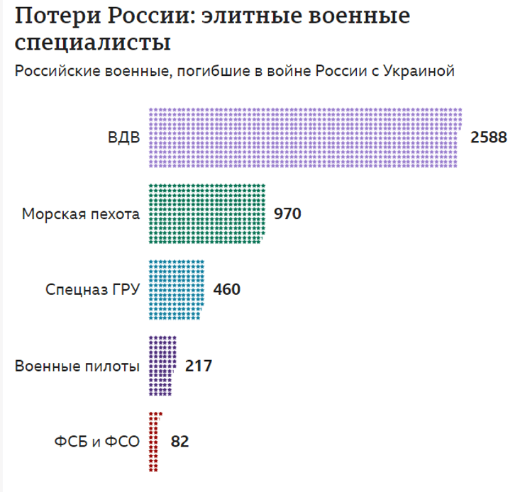 С начала вторжения Россия потеряла по меньшей мере 3354 офицера, включая 1016 элитных специалистов командного звена, таких как офицеры ВДВ, морской пехоты, спецназа, отрядов особого назначения Росгвардии и военных пилотов. Потеря таких офицеров может быть наиболее чувствительной и трудновосполнимой для российской армии. Недостаток координации и неспособность проводить более сложные наступательные маневры также привели к приостановке российского наступления на Донбассе, отмечают эксперты.