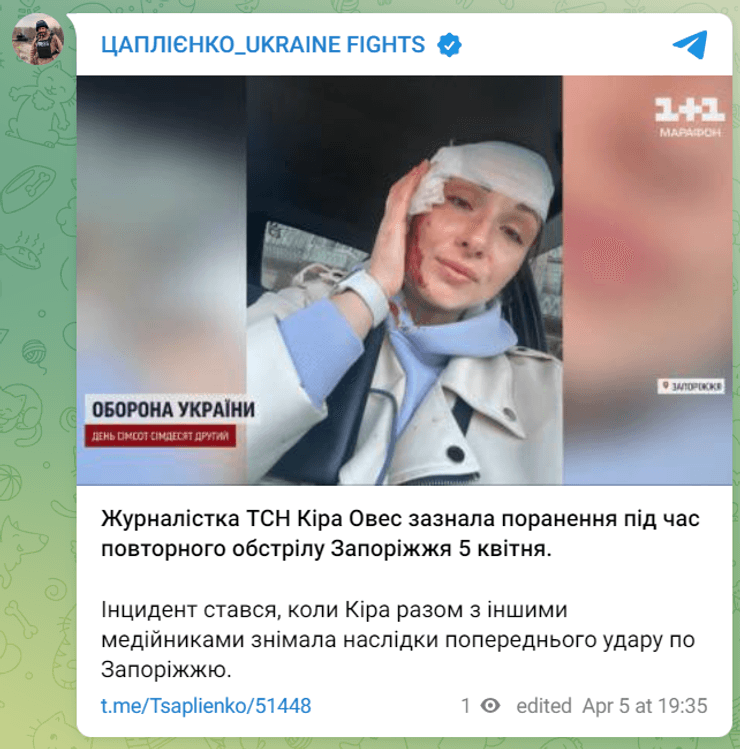 Журналист Андрей Цаплиенко в своем Telegram уточнил, что раненой журналисткой телеканала "1+1" является Кира Овес.