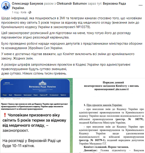 Комитет Верховной Рады Украины по вопросам правоохранительной деятельности исключит изменения в Уголовный кодекс Украины в законопроект №10379, которые предусматривают наказание для мужчин призывного возраста лишением свободы на срок от 3 до 5 лет. Об этом написал народный депутат от "Слуги народа" и член профильного комитета Александр Бакумов на своей странице в Facebook.