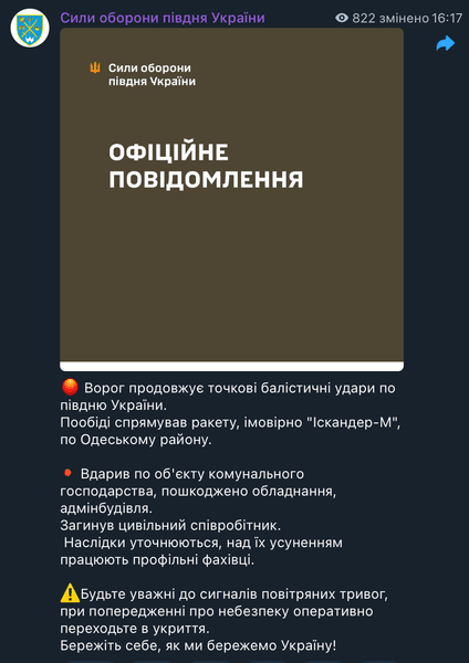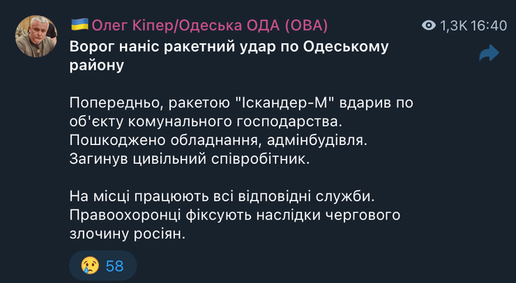 "После обеда направил (враг, — ред.) ракету, предположительно "Искандер-М", по Одесскому району", — говорится в сообщении.