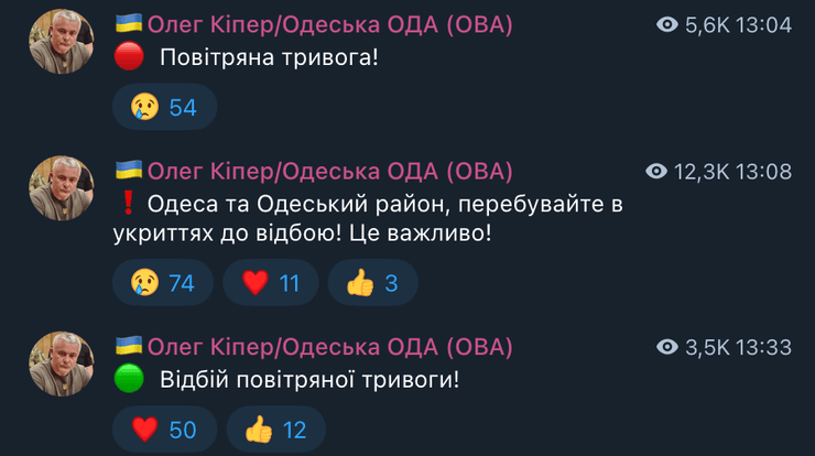 Глава Одесской областной военной администрации Олег Кипер рассказал, что в регионе воздушную тревогу объявили около 13:04, а отбой был объявлен в 13:30.