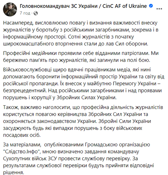 В своей заметке он также отметил, что журналистская деятельность пользуется уважением руководства ВСУ и охраняется законодательством Украины. По его словам, ВСУ осуждают любые случаи нарушений со стороны военных должностных лиц. От имени военных Главнокомандующий ВСУ выразил уважение и признание важности вклада журналистов в борьбу с российскими захватчиками, в том числе и в информационном пространстве. Сырский напомнил, что сотни журналистов с начала полномасштабного вторжения РФ стали в ряды Сил обороны.