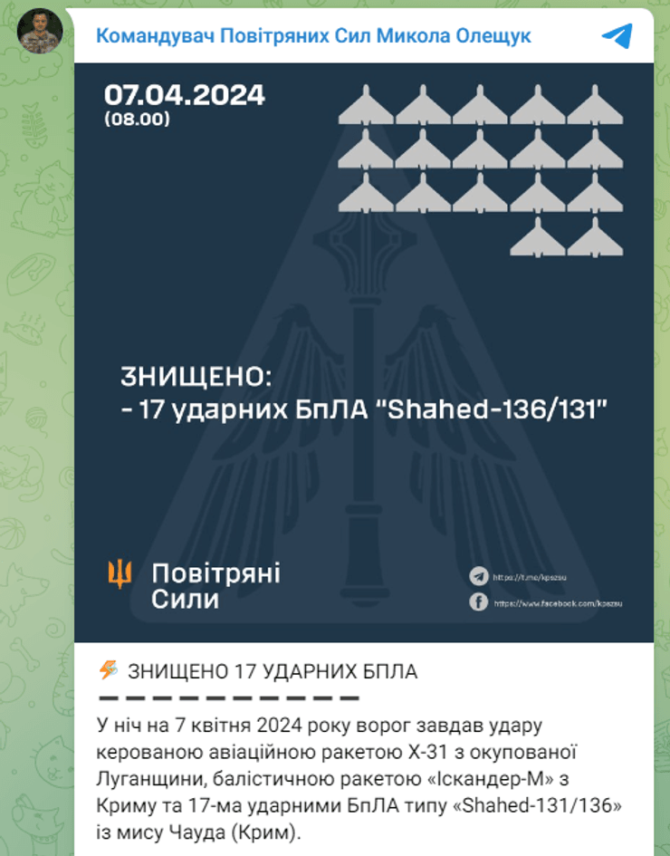В ночь на 7 апреля Россия атаковала Украину управляемой авиационной ракетой Х-31 из оккупированной Луганской области, баллистической ракетой "Искандер-М" из Крыма и запустила 17 ударных БпЛА типа "Shahed-131/136" с мыса Чауда, что в Крыму. Силам противовоздушной обороны удалось сбить все вражеские дроны. Об этом сообщил командующий Воздушных сил ВСУ Николай Олещук в Telegram.
