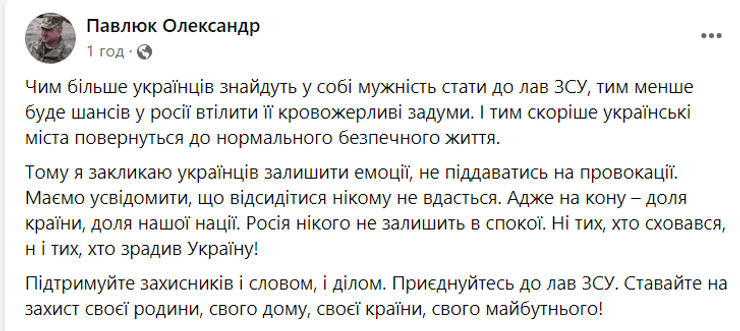 Украинцы должны противостоять оккупантам, став в ряды Вооруженных сил Украины, чтобы не воплотить их кровожадные замыслы. Александр Павлюк, командующий Сухопутных войск ВСУ, высказал свое мнение в Facebook.