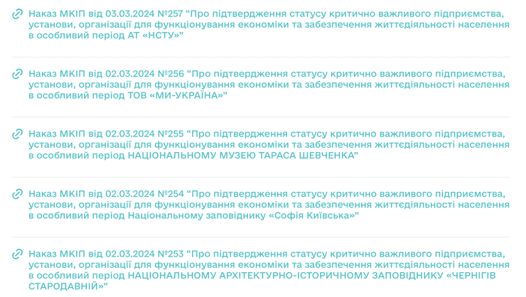 В тот же день также были изданы приказы о предоставлении статуса критически важного предприятия, учреждения или организации для функционирования экономики и обеспечения жизнедеятельности населения в особый период для Национального музея Тараса Шевченко, Национального заповедника "София Киевская" и Национального архитектурно-исторического заповедника "Чернигов древний".