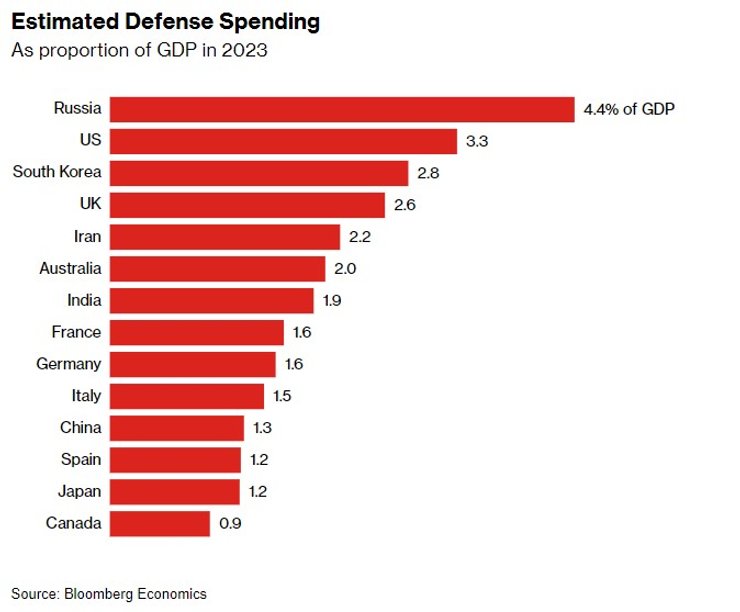 Эксперты утверждают, что рост военных бюджетов является глобальным явлением. Например, расходы Китая на оборону в 2024 году вырастут на 7,2%, что является максимумом за последние пять лет. Но пока в этом плане лидерство за Россией — в прошлом году Москва выделила на оборону 4,4% в доле от ВВП. За РФ идут Соединенные Штаты с 3,3%, а на третьем месте Южна Корея — 2,8% ВВП.