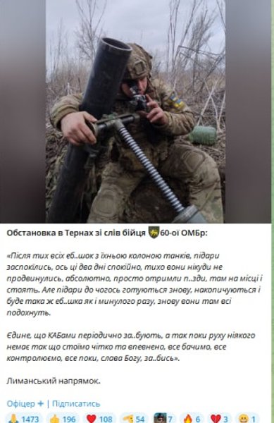В утреннем обращении Генштаба ВСУ 9 апреля сообщалось, что на Лиманском направлении Силы обороны отбили 1 атаку противника в районе населенного пункта Терны Донецкой области, где враг, при поддержке авиации, пытался прорвать оборону украинских войск.