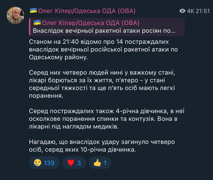"В результате очередного вражеского террора Одесской области погибли 4 человека, среди которых ребенок, еще 14 ранены", — говорится в сообщении.