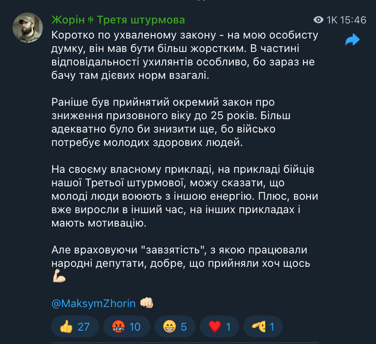 Майор ВСУ, заместитель командира Третьей отдельной штурмовой бригады Вооруженных сил Украины Максим Жорин заявил, что закон о мобилизации должен был быть жестче. Об этом он сообщил в своем Telegram.