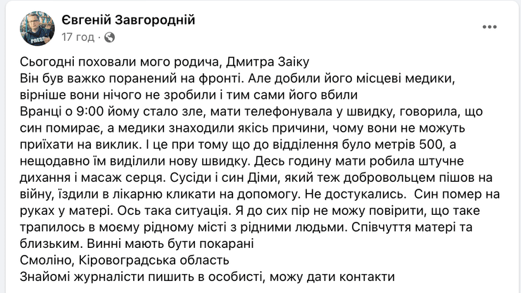 "Он (Дмитрий Заика, — ред.) был тяжело ранен на фронте. Но добили его местные медики, вернее они ничего не сделали и тем сами его убили", — написал Евгений Завгородний.
