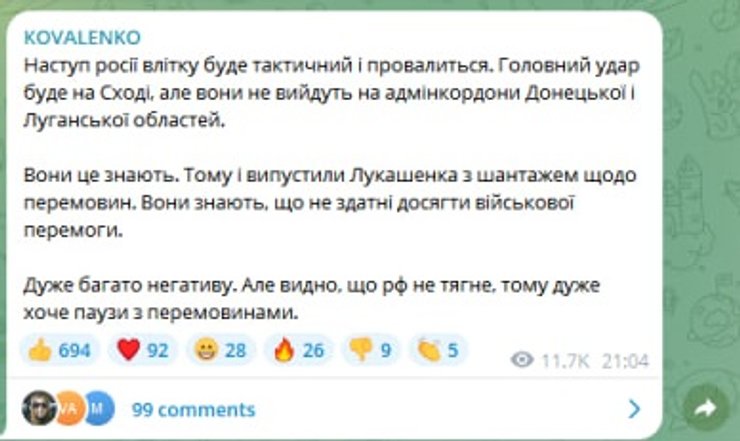 "Наступление России летом будет тактическое и провалится. Главный удар будет на востоке, но они не выйдут на админграницы Донецкой и Луганской областей. Они это знают. Поэтому и выпустили Лукашенко с шантажом относительно переговоров", — написал он.