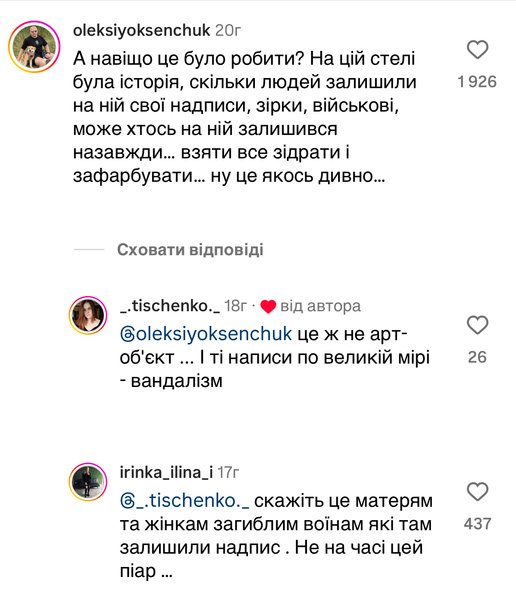 В комментарии в защиту инициативы, получившем лайк от авторов, говорится о том, что стелла — "не артобъект", а надписи военных можно считать вандализмом.