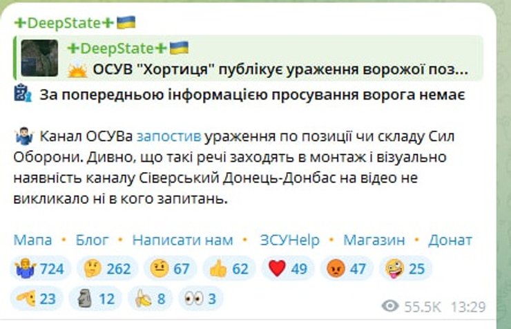 "По предварительной информации, продвижения врага нет. Канал ОСУВ "Таврия" запостил поражение позиции или склада Сил Обороны. Удивительно, что такие вещи заходят в монтаж и визуально наличие канала Северский Донец-Донбасс на видео не вызвало ни у кого вопросов", — говорится в сообщении.
