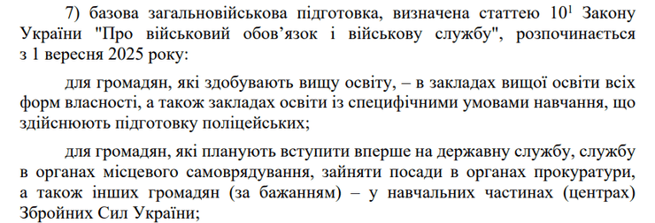 Согласно тексту закона, базовая общевойсковая подготовка, определенная статьей 10¹ Закона Украины "О воинской обязанности и военной службе", начинается с 1 сентября 2025 года: