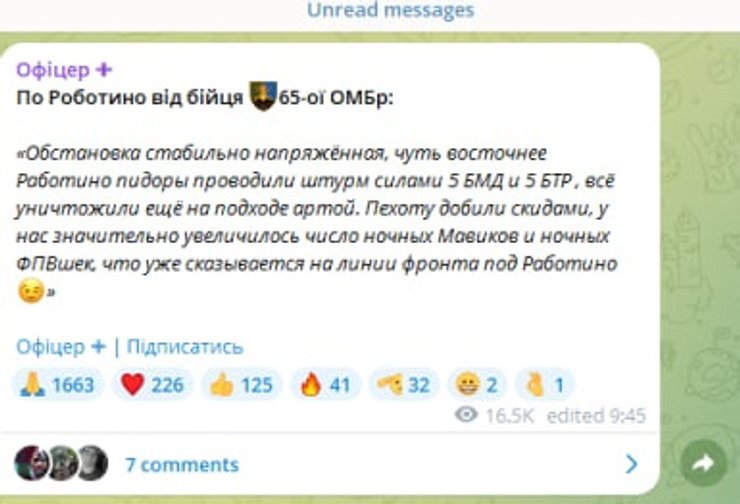 Российские оккупанты не оставляют попыток вернуть утраченные позиции в районе Работино в Запорожье. Бойцы ВСУ отбили очередной штурм россиян на бронетехнике. Об этом сообщил в своем телеграм-канале "Офицер+" лейтенант ВСУ с позывным "Алекс" со ссылкой на слова бойца 65-й бригады.