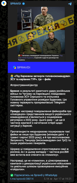 В российских Telegram-каналах заявили о так называемой "ликвидации" главнокомандующего ВСУ Александра Сырского и руководителя Главного управления разведки Кирилла Буданова в результате ракетного удара по Чугуеву Харьковской области. Однако это фейковая информация. Об этом сообщили в Центре стратегических коммуникаций (SPRAVDI) в Telegram.