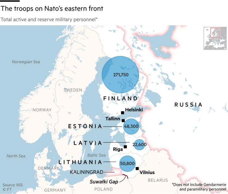 Страны Балтии, вступившие в НАТО почти 20 лет назад, давно предупреждали европейских союзников о российском реваншизме, однако только сейчас те стали прислушиваться к ним. Вместе с тем военные считают, что у России сейчас мало ресурсов для нападения на страны альянса, однако, например, Служба внешней разведки Эстонии заявила в феврале 2024 года, что "русские в собственных рассуждениях исходят из того, что военный конфликт с НАТО возможен в следующем десятилетии".