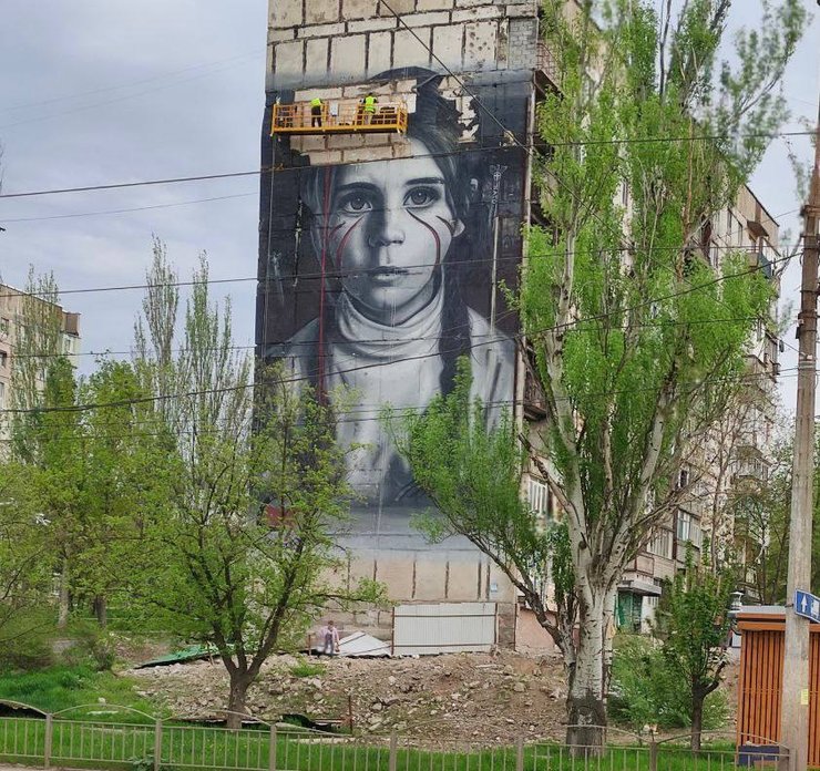 Как отмечается, все стены этого 9-этажного дома были усеяны дырками от российских снарядов после обстрела города, но оккупационная власть, чтобы не делать ремонт, просто решила прикрыть "недостатки". В этом ей помог итальянский уличный художник Джорит Чиро Черулло, который работает под псевдонимом Jorit, создав мурал с девочкой, на которую якобы "падают бомбы".