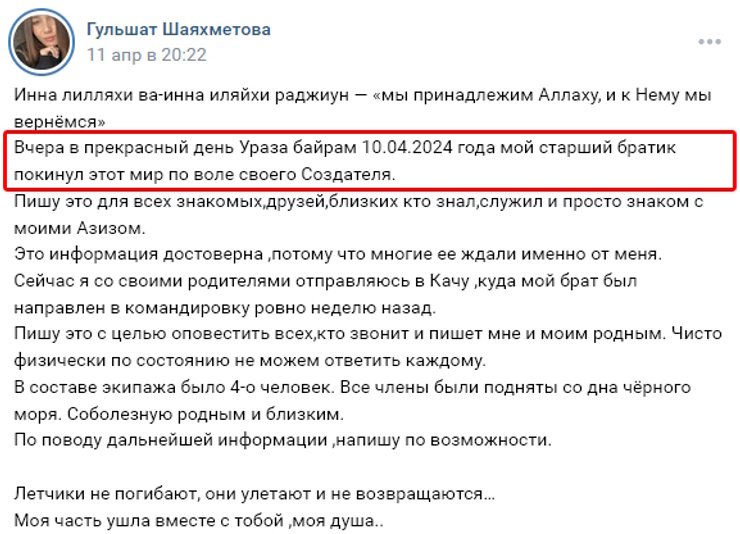 Младшая сестра Шаяхметова в запрещенной в Украине социальной сети "ВКонтакте" написала, что ее брата командировали в Качу всего за неделю до гибели.