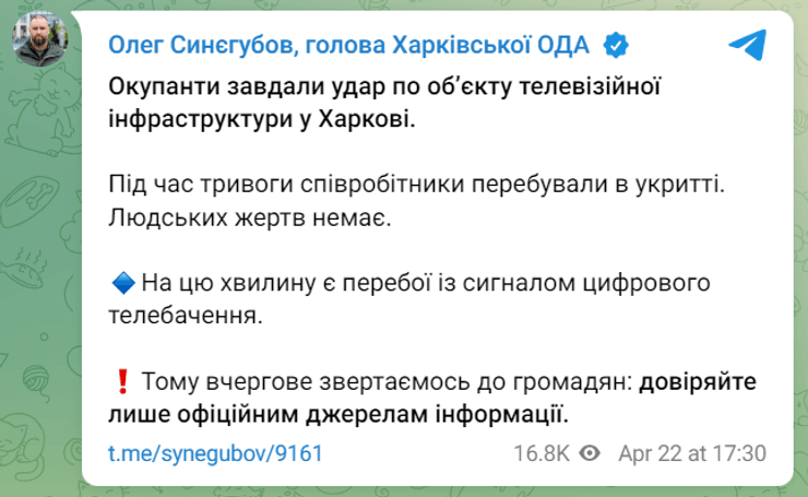 "На эту минуту есть перебои с сигналом цифрового телевидения. Поэтому в очередной раз обращаемся к гражданам: доверяйте только официальным источникам информации", — отметил начальник Харьковской ОГА.