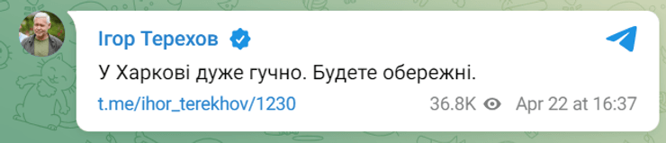 Городской голова Харькова Игорь Терехов в Telegram в 16:37 сообщал, что в городе "очень громко".