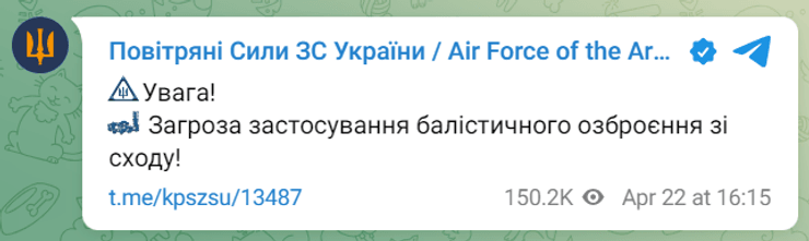 Воздушная тревога в Харьковской области продолжалась с 14:55 до 17:26. В это время Воздушные Силы ВСУ сообщали об угрозе применения оккупантами баллистического вооружения и возможном применении ВС авиационных средств.