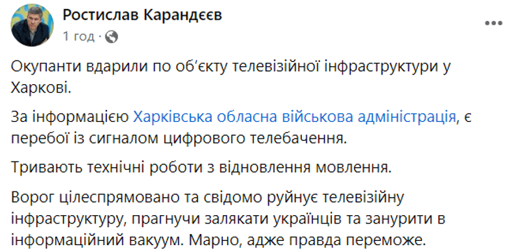 "Враг целенаправленно и сознательно разрушает телевизионную инфраструктуру, стремясь запугать украинцев и погрузить в информационный вакуум. Напрасно, ведь правда победит", — написал он на своей странице в Facebook.
