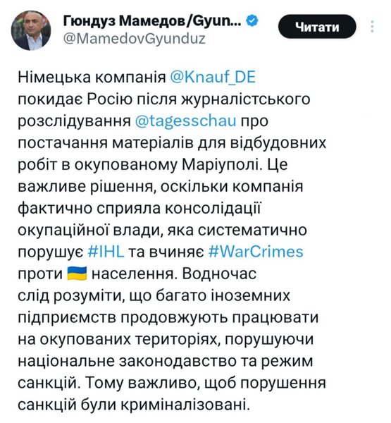 "Это важное решение, поскольку немецкая компания фактически способствовала укреплению оккупационной власти, которая систематически нарушает международное гуманитарное право и совершает военные преступления против населения. В то же время необходимо понимать, что многие иностранные предприятия продолжают работать на оккупированных территориях, нарушая национальное законодательство и режим санкций. Именно поэтому важно, чтобы нарушения санкций были криминализированы", — отметил Гюндуз Мамедов, эксперт по национальному и международному праву, заместитель генерального прокурора Украины в 2019-2021 годах.