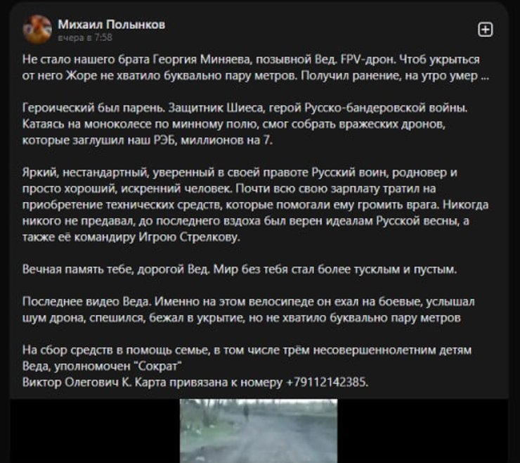 "Не стало нашего брата Георгия Миняева, позывной "Вед". FPV-дрон. Чтобы спрятаться от него Жоре не хватило буквально несколько метров. Получил ранение, на утро умер", — написал он.