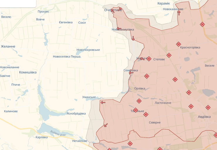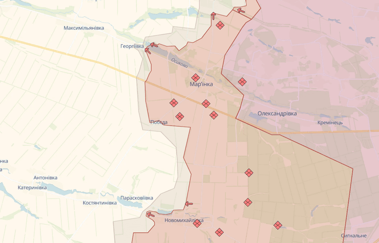 В населенных пунктах Очеретино, Новобахмутовка, Новокалиново, Бердичи, Семеновка и к югу от Георгиевки, по информации аналитиков DeepState, зафиксировали продвижение войск РФ.