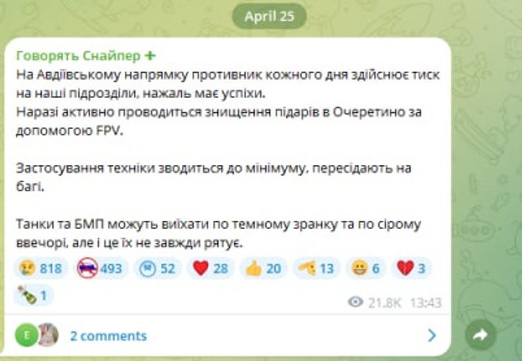 "На Авдеевском направлении противник каждый день осуществляет давление на наши подразделения, к сожалению, имеет успехи. Сейчас активно проводится уничтожение п**аров в Очеретино с помощью FPV", — проинформировал он.