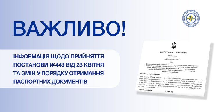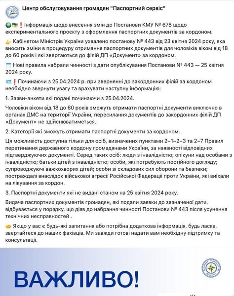 Отмечается, что Кабмин Украины принял постановление № 443 от 23 апреля 2024 года, которое вносит изменения в процедуру получения паспортных документов для мужчин в возрасте от 18 до 60 лет и которые обращаются в филиалы ГП "Документ" за рубежом. Новые правила вступили в силу с 25 апреля 2024 года.