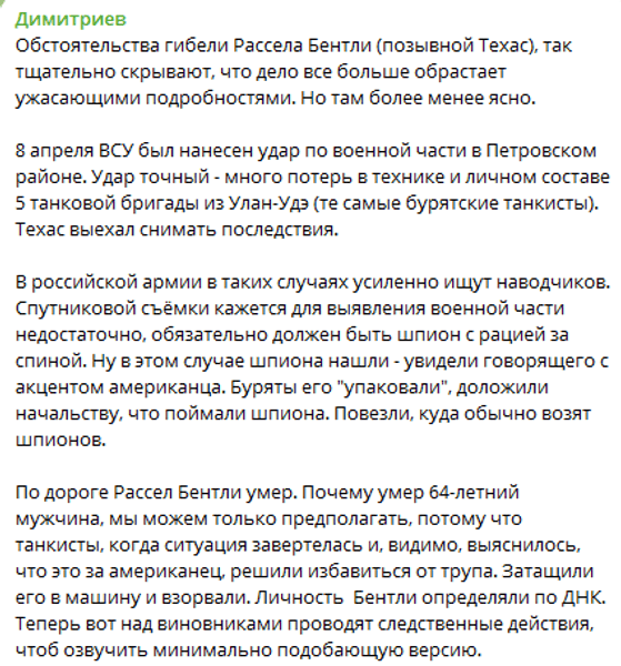 Обстоятельства гибели американского беглого уголовника Рассела Бентли с позывным "Техас", приехавшим из США в оккупированный Донецк "строить русский мир", обрастают новыми подробностями. Об этом в Telеgram пишет коллаборант и бывший депутат Одесского городского совета от пророссийской партии "Родина" Игорь Димитриев.