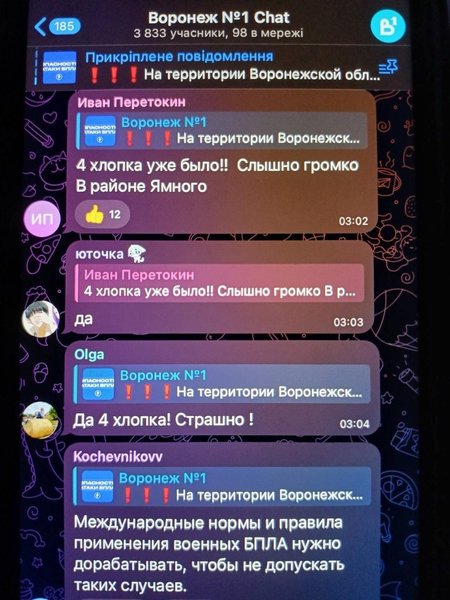 Кроме того, пользователи в социальных сетей сообщали о дронах в небе над Воронежской областью, а также жаловались на "4 хлопка". Там также якобы работала ПВО. Российские СМИ сообщили, что в результате сбития одного из беспилотников поврежден дом.