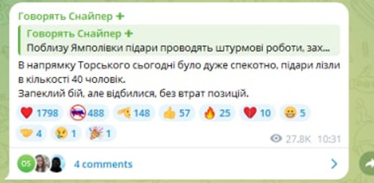 "В направлении Торского сегодня было очень жарко, п*дары лезли в количестве 40 человек. Ожесточенный бой, но отбились, без потерь позиций", — проинформировал "Осман".