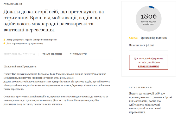 В пятницу, 3 мая, дальнобойщики на сайте президента Украины зарегистрировали электронную петицию под номером №22/225442-эп с призывом предоставить им бронь от мобилизации. Автором документа является Дмитрий Карягин.