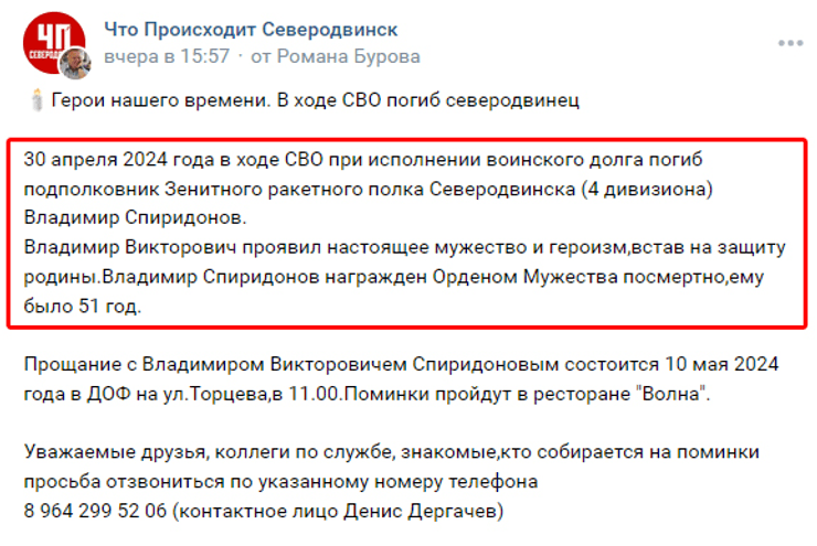Он обнаружил некролог на российского подполковника Владимира Спиридонова из 1528-го зенитного ракетного полка. Дата смерти указана 30 апреля. Указанный полк является операторами ЗРК С-400.