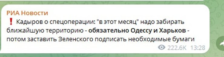 "Я считаю, что надо активнее нападать, бить надо жестко, пока есть время. В этом месяце надо забирать ближайшую территорию — обязательно Одессу и Харьков — потом заставить Зеленского подписать необходимые бумаги", — заявил Кадыров.